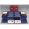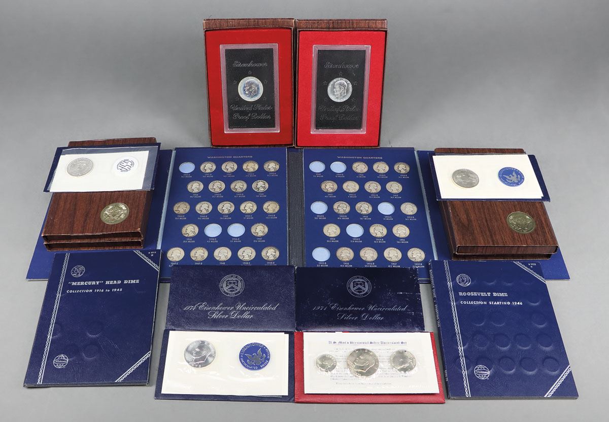 over 150 coins including a GSA U.S. Morgan Dollar dated 1881-O in CU condition; Brown cased Proof Eisenhower Dollars dated 1971, 1972, 1973 and 1974 (3); five uncirculated Eisenhower dollars, 1971-76; two Whitman dime coin books, a Mercury dime and Roosevelt Dime books with circulated coins and a Washington quarter book, all circulated and no key dates, with a total face value of 90% silver in all three books of $23.25; estimated silver value of over $650 (150+). Shipping charges apply - weight 6.2 lbs. (photo on web site)