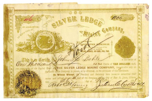 Illinois (Possibly Colorado). 1000 Shares Capital Stock Issued Certificate, Gold print, Eagle at left side of certificate and miners at right, Low serial number: 46, Fine condition with toning and light stains.
