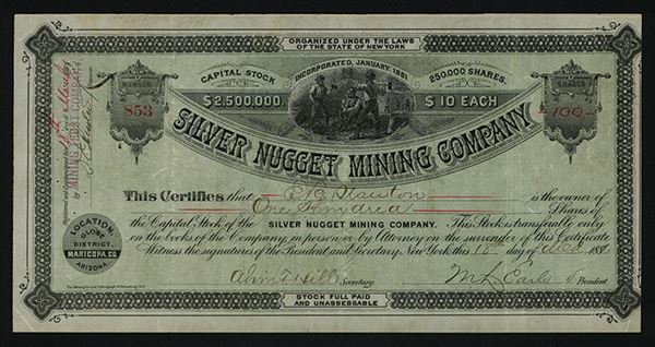 Arizona Territory, 1881, 100 shares. Black border on green underprint, miners working in middle with arched title on beneath. Appears XF but there are numerous pin holes that are difficult to see on the left side of the stock. "Location Globe District, Maricopa Co., Arizona". Rare and early Arizona mine and a very attractive stock certificate.