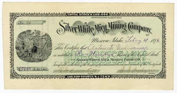 Moscow, Idaho. 500 Shares, I/U, Black on light green underprint, Mining scene art left, ornate title top middle-right. S/N 81. Signed by E.E. Rodgers as president and R.M. Crockett as Secretary. VF condition. Scarce Idaho mining certificate.