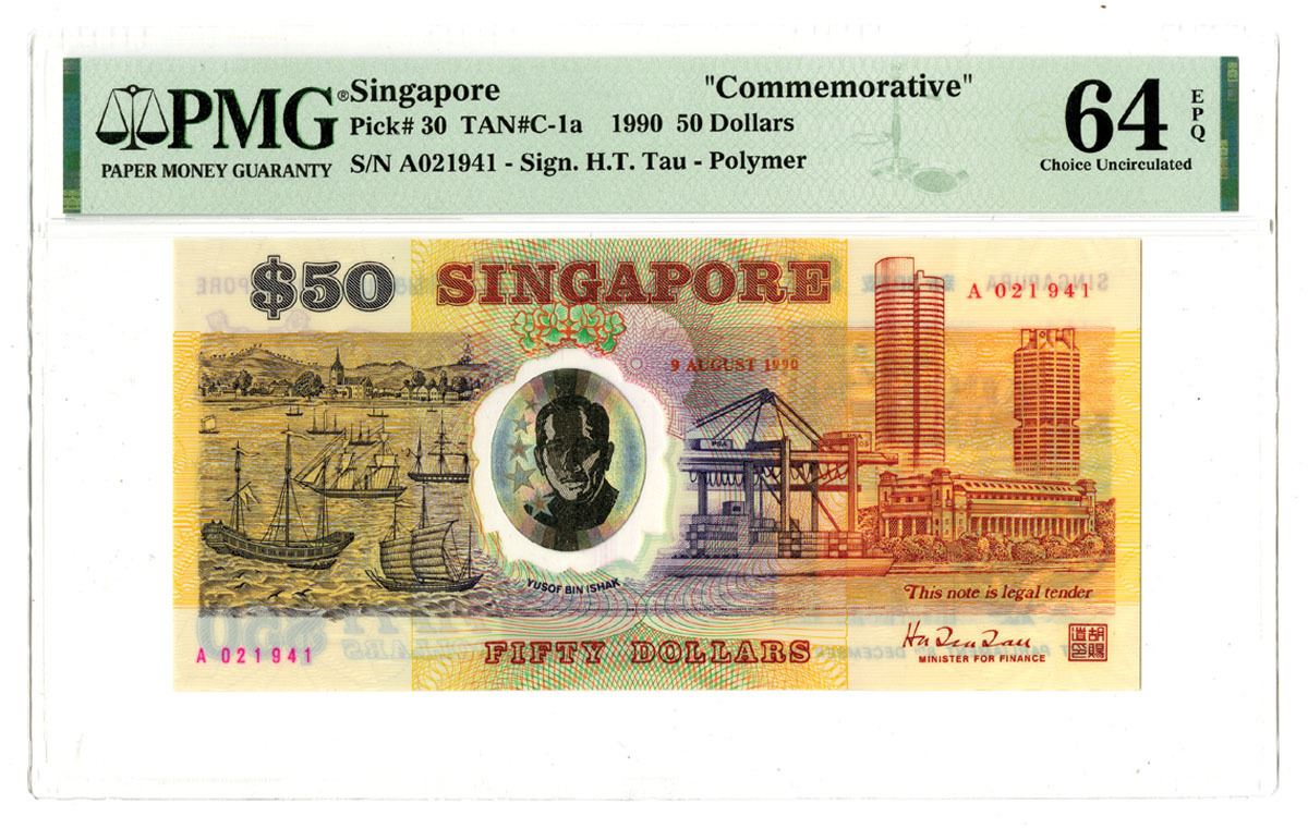 Singapore, 1990. 50 Dollars, P-30 TAN#C-1a, Issued Commemorative Banknote, Red and purple on m/c underprint, Silver hologram of Yusof bin Ishak at center and old harbor scene at left with modern building at right, Back is m/c with first parliament at left and people with flag at right, Note commemorates 25th Anniversary of Independence, S/N A021941, PMG graded Choice Uncirculated 64 EPQ.