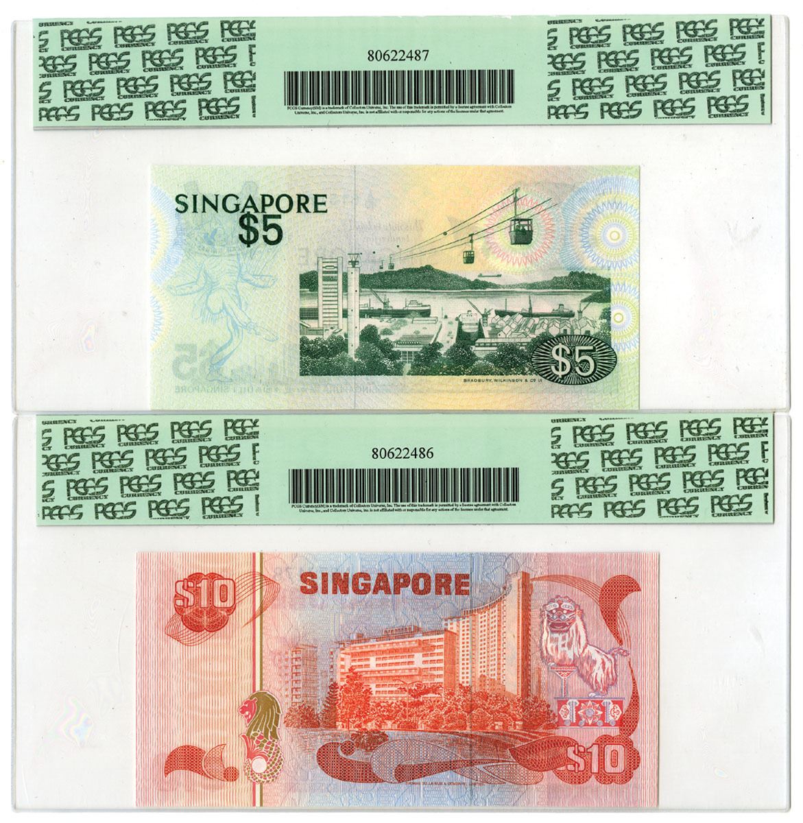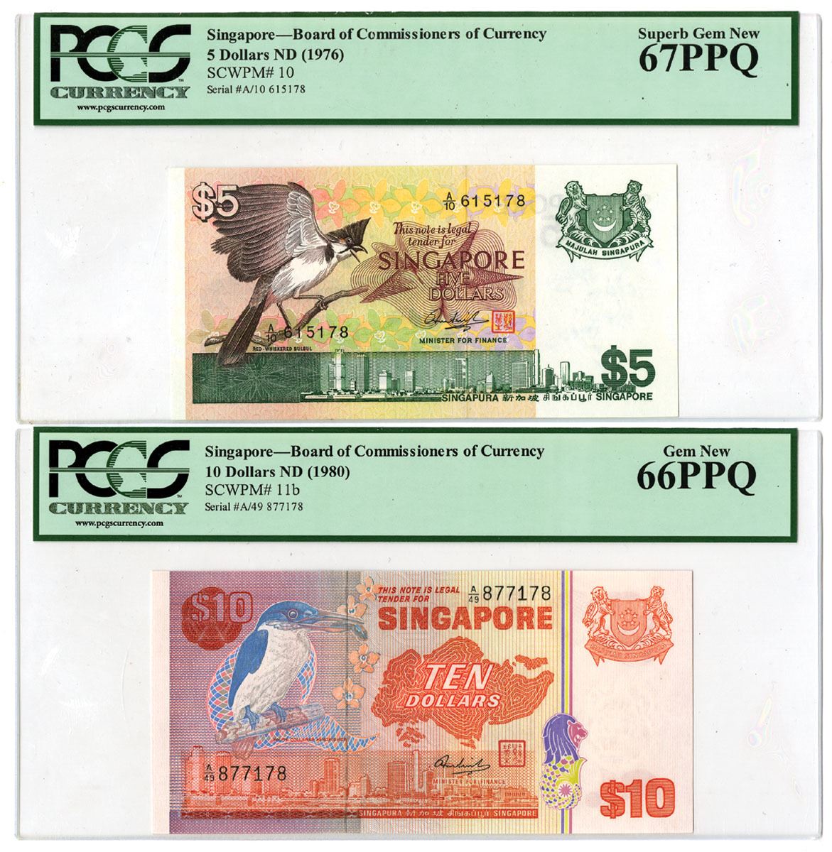 Singapore, ND (1976-1980). Lot of 2 Issued Banknotes, Includes: ND (1976) 5 Dollars, P-10, S/N A/10 615178, PCGS graded Superb Gem New 67PPQ; ND (1980) 10 Dollars, P-11b, S/N A/49 877178, PCGS graded Gem New 66PPQ. (2). Attractive banknote pair.