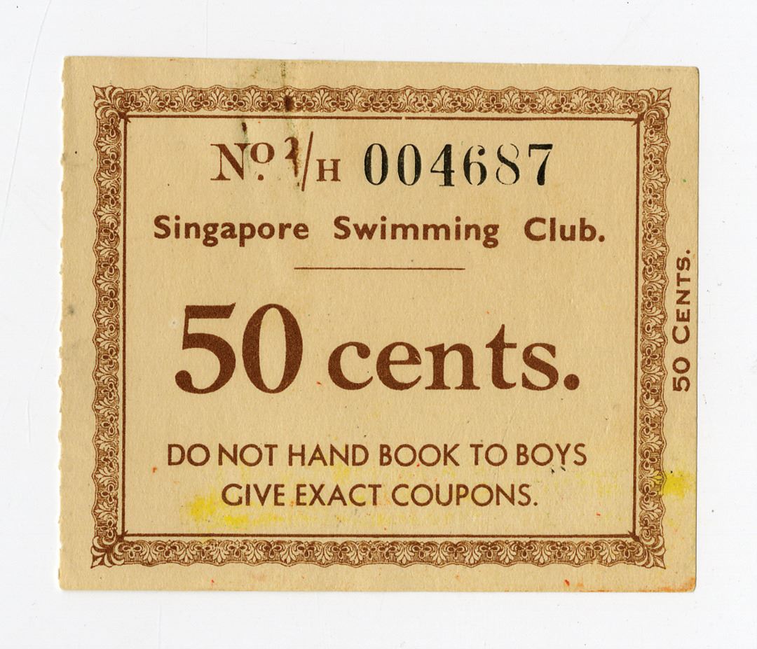 Singapore, ND ca.1920-40s, 50 Cent Scrip Note from the Singapore Swimming Club, Brown text with brown border, S/N 004687. AU to Uncirculated with evidence of a paper clip mark and small areas of rust from the paper clip. The bottom of the note states "Do not hand book to boys - give exact coupons". In the early 1890's, a group of young European men discovered a splendid spot for swimming and recreation located at the southeastern portion of Singapore. The Singapore Swimming Club was founded on a sand bank off Tanjong Katong beach. By 1897, the club was organizing regular swimming races at these premises. In addition, it is recorded within the club's records that water polo was also played since 1902.