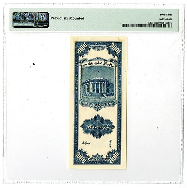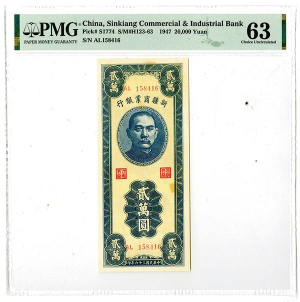 China. 1947, 20,000 Yuan, P-S1774, issued banknote, blue on light yellow underprint, SYS at top middle, back blue with bank building. S/N AL 158416, PMG graded Choice Uncirculated 63, Scarce and attractive note with large even margins and bright colors. This is the only uncirculated example in the