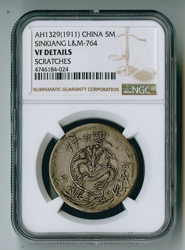 Sinkiang Province, China. 5 Miscals, AH1329 (1911), Y# 31.2, L&M-764, NGC Graded VF Details with note of scratches.