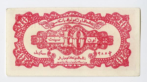 ChinaÉ 1 Chiao = 10 Cents, P-S1800 S/M#H125-21, red, landscape, mountain at center, back red, S/N AD 454478, Uncirculated to CU condition. Rare in high grade. This was last offered at auction in 2014, all in lower grade, this example is far superior.