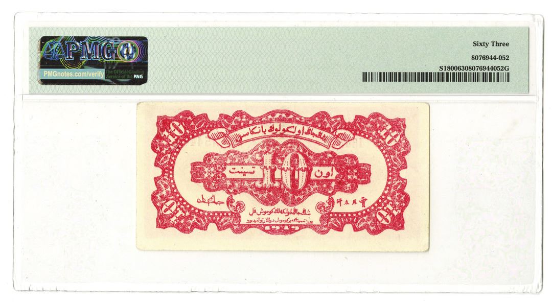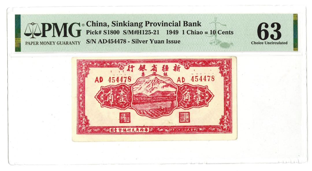 China. 1 Chiao = 10 Cents, P-S1800 S/M#H125-21, red, landscape, mountain at center, back red, S/N AD 454478, PMG graded Choice Uncirculated 63. Only 3 examples graded in the PMG census, this being the second highest.