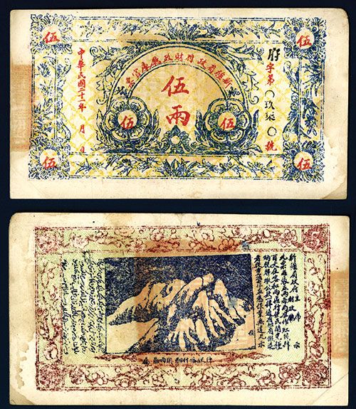 5 Taels, P-S1780, (S/M#H123.5-10), Issued, Snow capped mountains at center, Choice VG to XF with light stains on the right border. Scarce in higher grade.