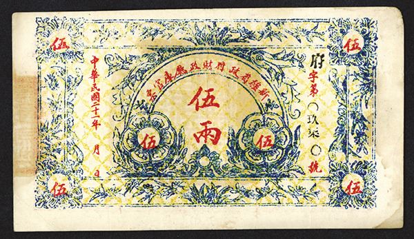5 Taels, P-S1780, (S/M#H123.5-10), Issued, Snow capped mountains at center, Choice VG to XF with light stains on the right border. Scarce in higher grade.