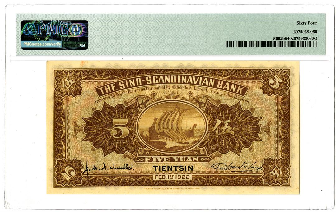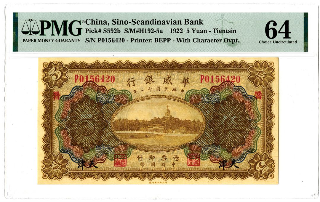 China. 1922. 5 Yuan - Tientsin, P-S592b S/M#H192-5a, Issued banknote, Brown on multicolor underprint, S/N P0156420, PMG graded Choice Uncirculated 64. Printer: BEPP - With Character Ovpt.