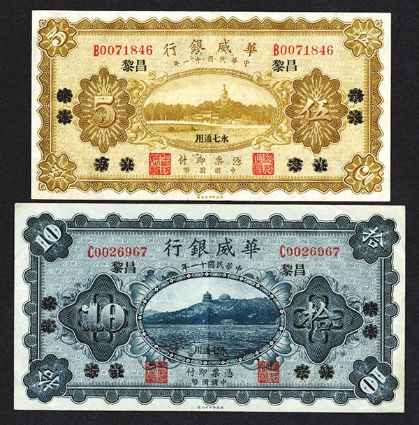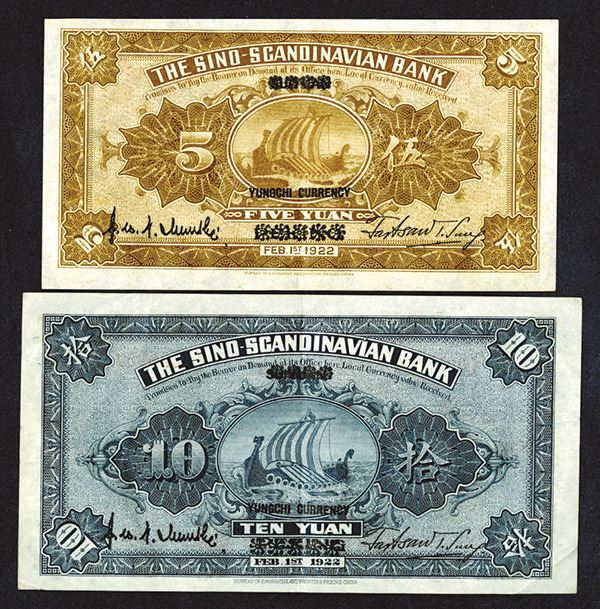 China, Lot of 2 notes, Includes 5 Yuan, P-S581 S/M#H192-4b, Issued brown, bridge with building, printed on P-S587; 10 Yuan, P-S590C S/M#H192-6, Blue with pagoda on shore, both overprinted on Peking notes with rosettes overprinting previous place names, Suiyuan overprints on back over rosettes, Yungchi Currency overprinted on back, both are Choice XF to AU. BEPP. Attractive pair of notes, the 10 Yuan is unpriced in SCWPM.