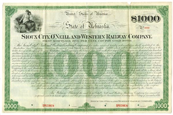 Nebraska. $1000 Specimen 5% 1st Mortgage Gold Coupon Bond, Black print on green border and under tint in large format and horizontal style, Small vignette of allegorical woman with children at top left corner, Specimen overprints and POC's, Fine condition with splitting and cracking along fold lines, ABNC. This is very possibly unique and is the pictured bond in Cox that we submitted over 10 years ago. It has not been offered since.