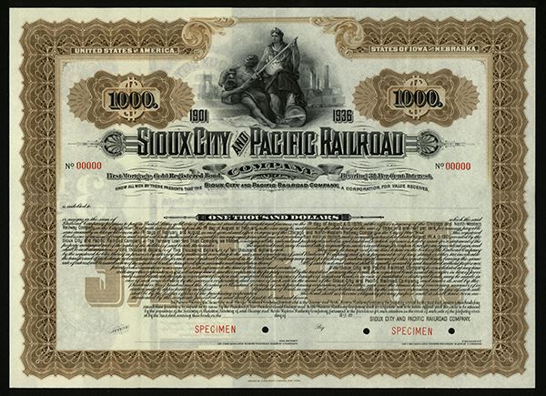 Iowa, 1901, $1000 bond, Specimen, Woman with sword, man holds locomotive, Brown, ABNC, POC's, XF.