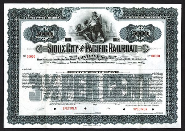 Iowa and Nebraska, 1901, $5000, Registered 1st Mortgage Gold Bond 3 1/2% Gold Bond, Black on slate blue border and underprint, Seated allegorical man and woman with locomotive and industrial scene, POC's, VF condition, ABNC. Attractive and rare bond.