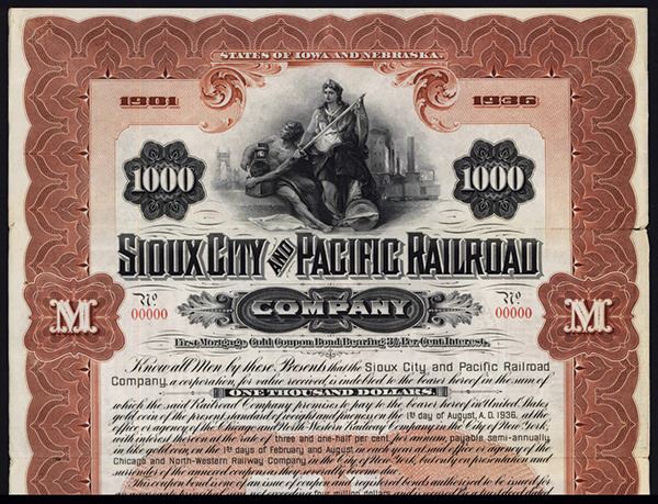Iowa and Nebraska, 1901, Specimen $1000, 1st Mortgage 3 1/2% Gold Coupon Bond, Black on brown border and underprint, allegorical man and woman at top, Vertical format, Coupons attached, POC's and red s/n "00000", ABNC. Only known as a specimen in Cox.
