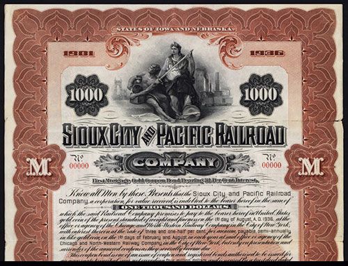 Iowa and Nebraska, 1901, $1000, 1st Mortgage 3 1/2% Gold Specimen Bond, Vertical format, Coupons attached, POC's and red s/n “00000 “, ABNC.