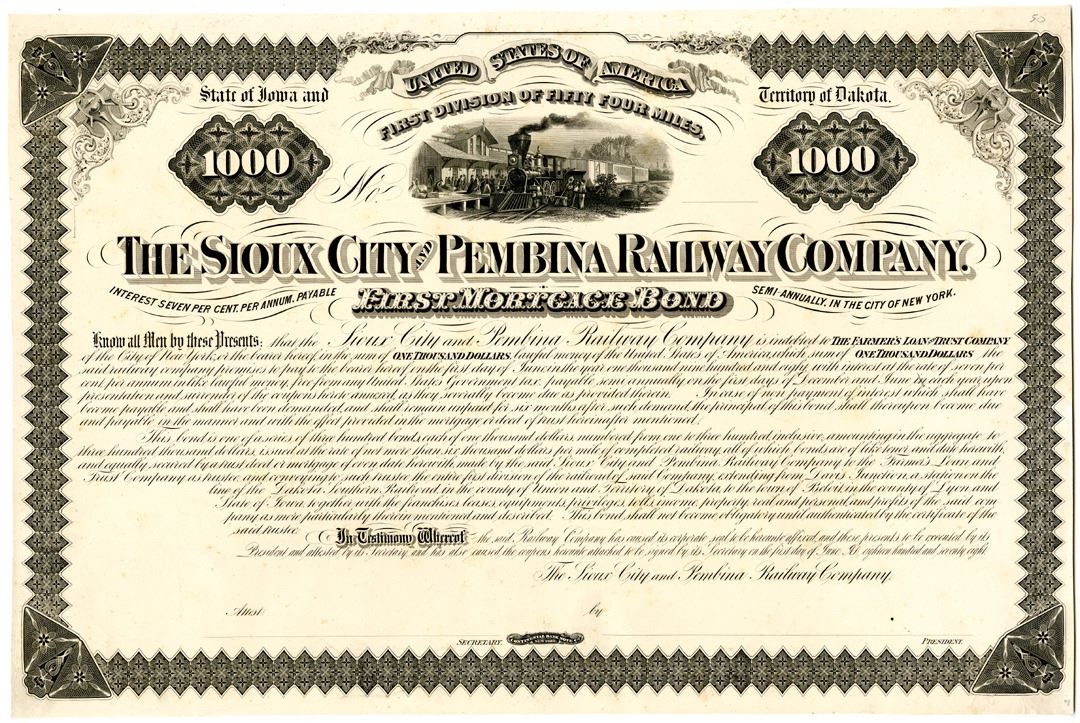Dakota Territory and Iowa, 1878. $1000 Proof 7% First Mortgage Bond, Black text with black border, on white cardstock, Train stopped at rural station at top center. Fine-VF condition with some toning, Continental Bank Note Co. Unlisted as a proof in Cox, Rare.