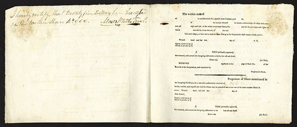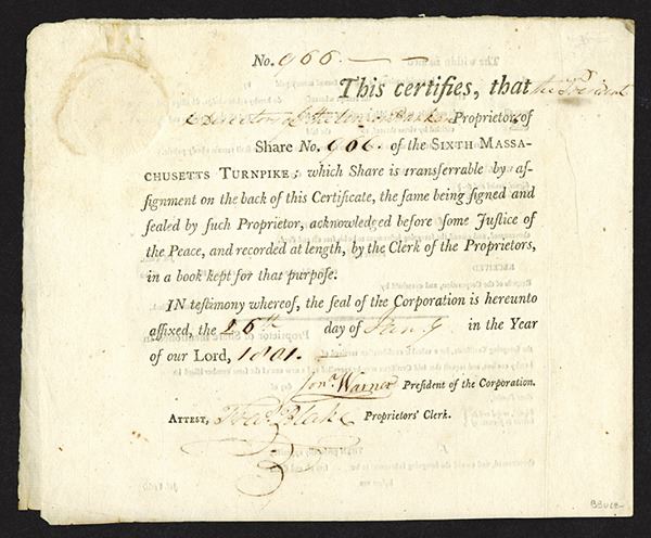 Massachusetts, January, 26th, 1801, 1 Share, Issued and uncancelled, Black on plain form, S/N 966, Issued to the President & Directors of the Union Bank, signed by Jonathan Warner as president and F Blake as clerk, seal on upper left, the inner page has note " I hereby certify, that twenty-five dollars have been paid on the within Share No.966, Moses Whrith, Treas.", VF to XF condition.