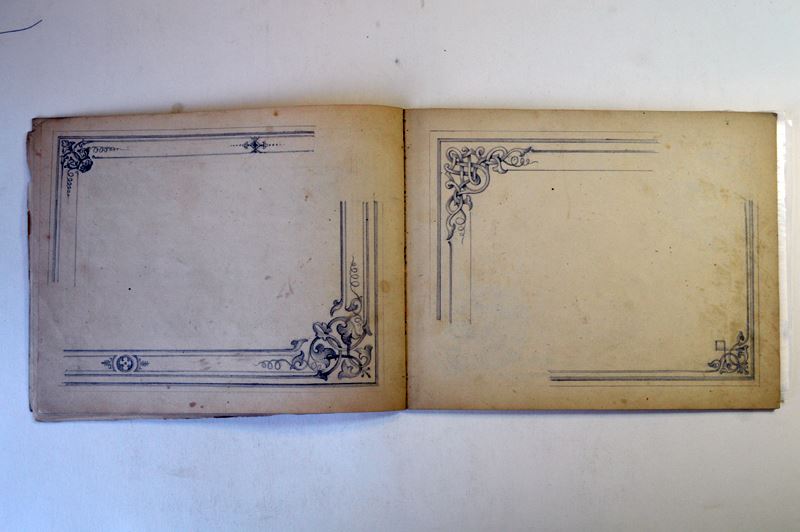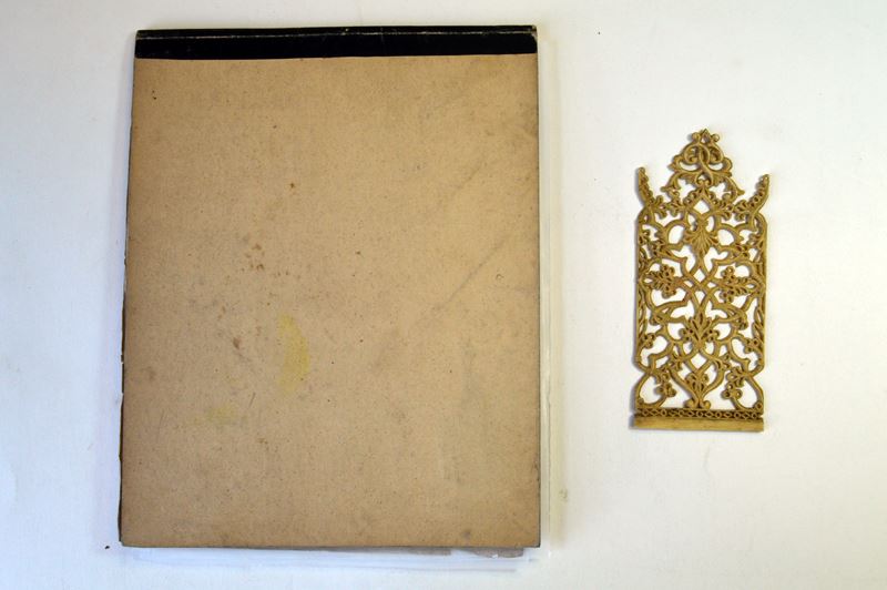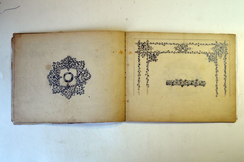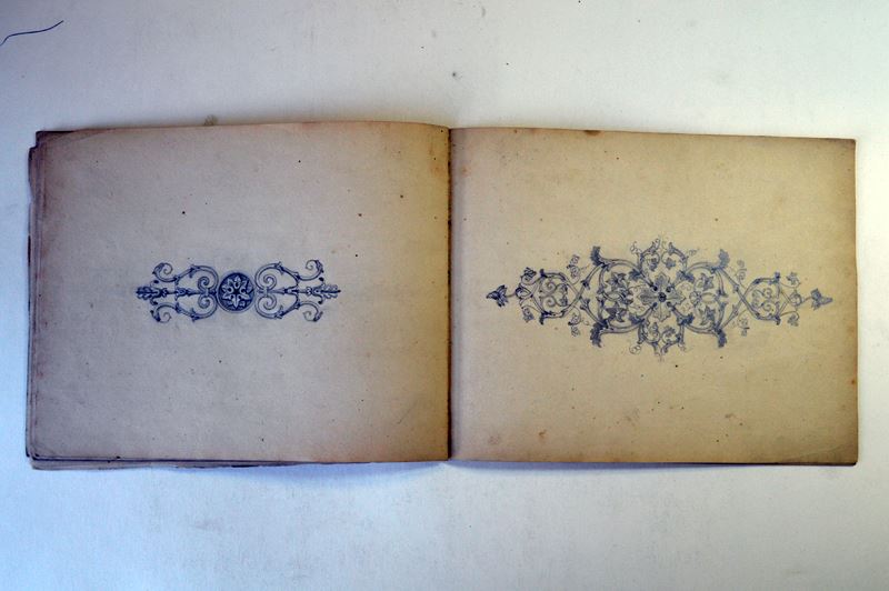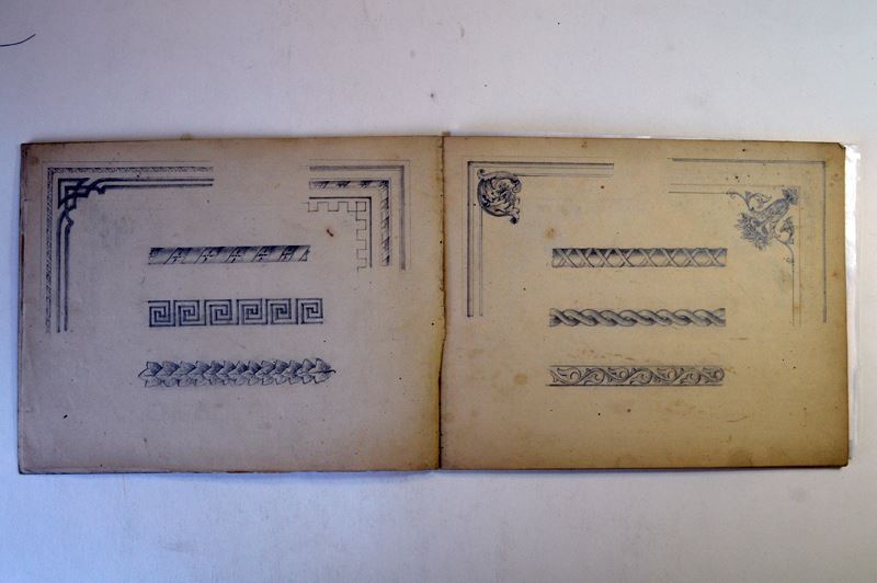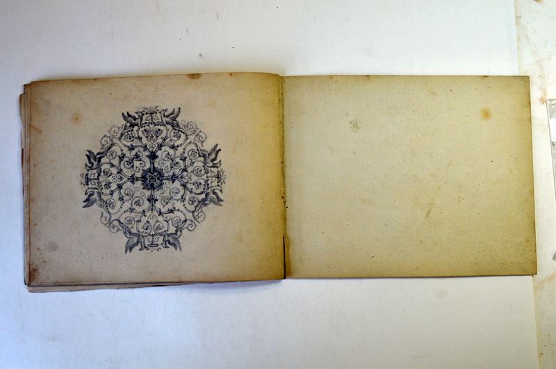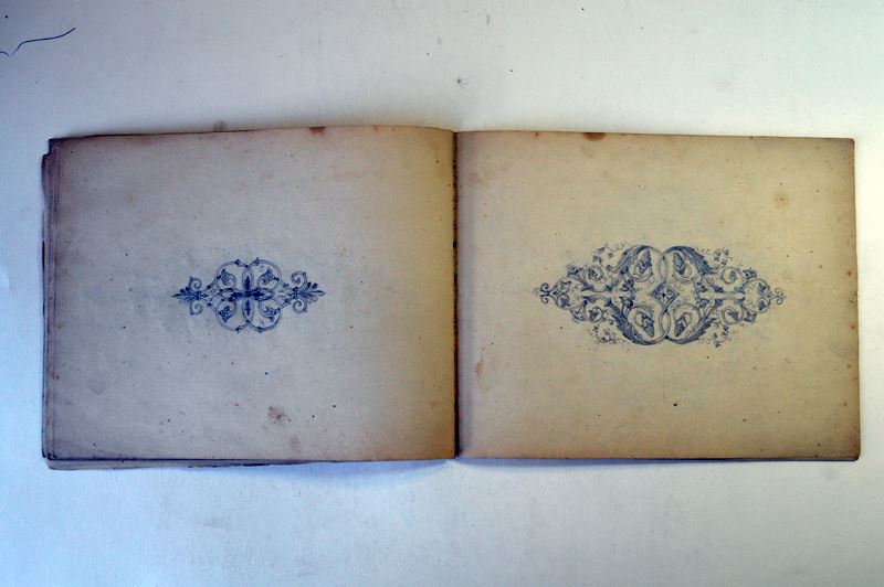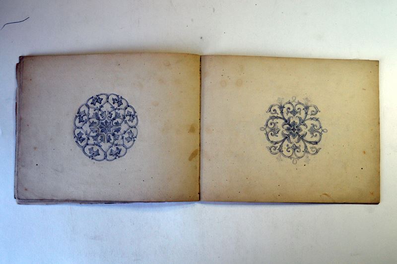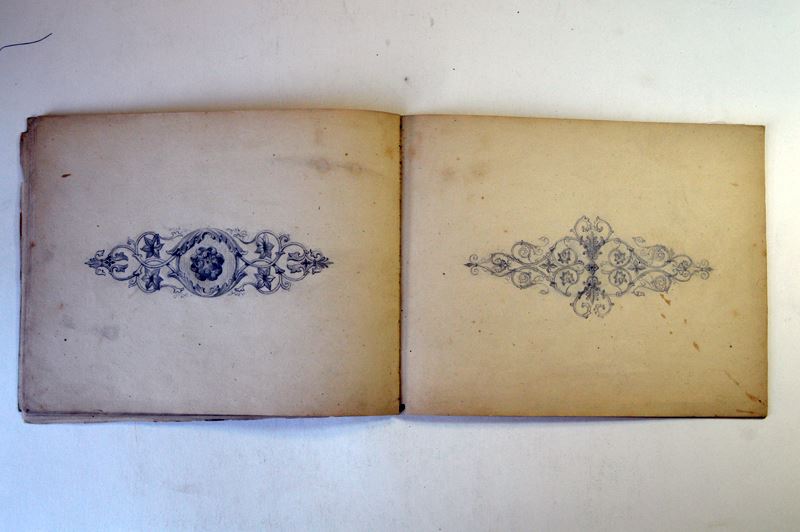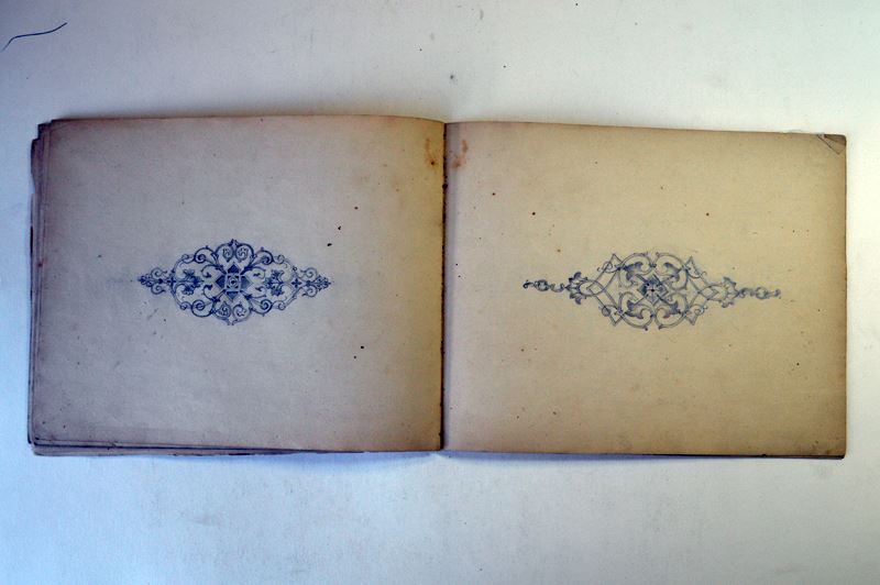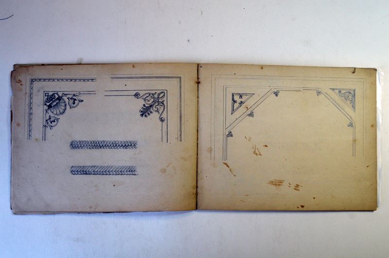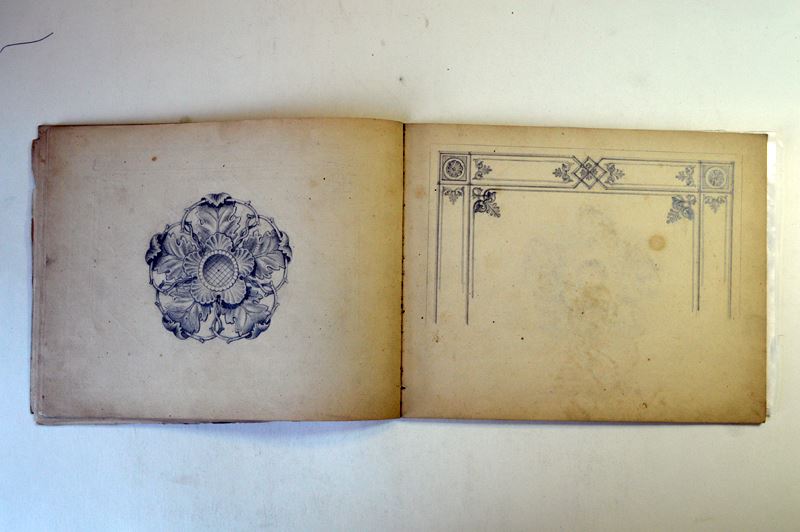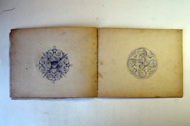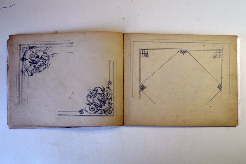 Sketchbook of 13 pages filled with pencil borders, corners, ornate medallions. 8x6-1/4 inches. Also included is a very ornate open work screen design.