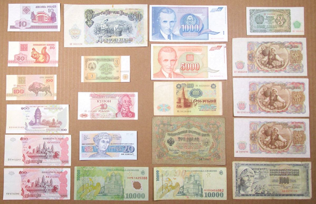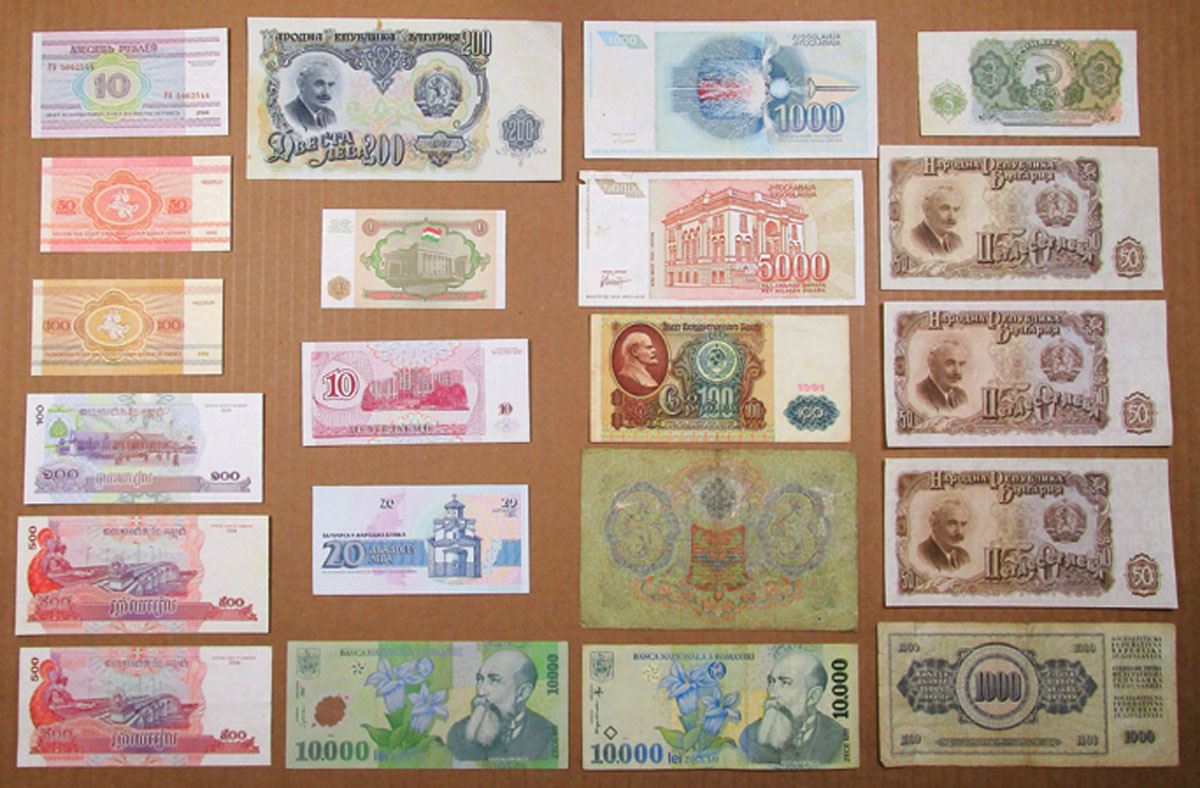 Eastern Europe. Lot of 20+ Banknotes from Various Slavic Countries, Including: Russia, Bulgaria, Transnistria, Romania, and Yugoslavia, Notes range from Fine to XF condition. (21).