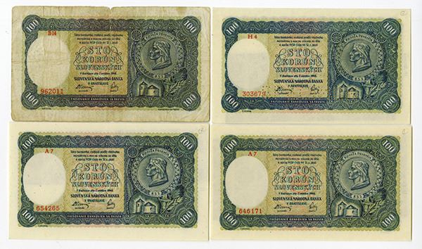 Slovakia, Lot of 4 notes, All are 100 Korun notes, Includes P-10a (3), VG to XF and P-10s, specimen, XF/AU.