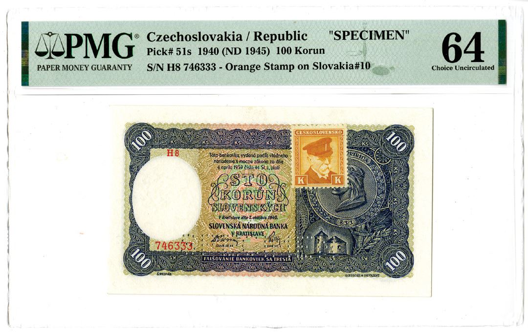 Czechoslovakia/Republic. 1940 (ND 1945). 100 Korun, P-51s, Specimen banknote, Dark blue on multicolor underprint, S/N H8 746333, Orange Stamp on Slovakia #10, PMG graded Choice Uncirculated 64.