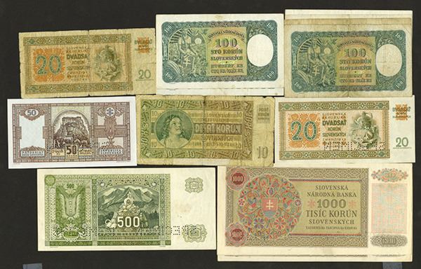Slovakia. 10, 20, 50, 100, 500, 1000 Korun. P-4a (Good, extensive paper separation); 7a, s; 9s; 10a (4), s (2); 12s; 13s (2). The issued notes are Very Good or so; the Specimens Very Fine or better. 13 pieces.