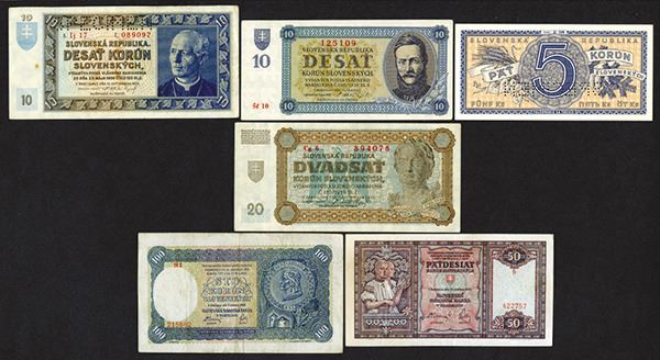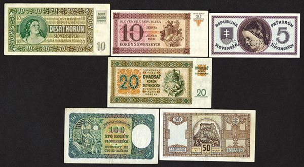 Slovakia. 5, 10, 20, 50, 100 Korun. P-5s; 6a; 7a; 8s; 9a; 10a. A nice wartime group. Very Fine to Uncirculated. 6 pieces