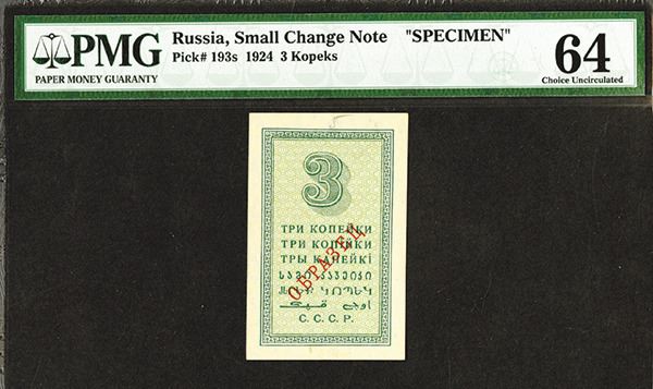 Russia. 3 Kopeks. P-193s. Red diagonal "SPECIMEN" overprint on face. Uniface. PMG graded Choice Uncirculated 64, annotation.