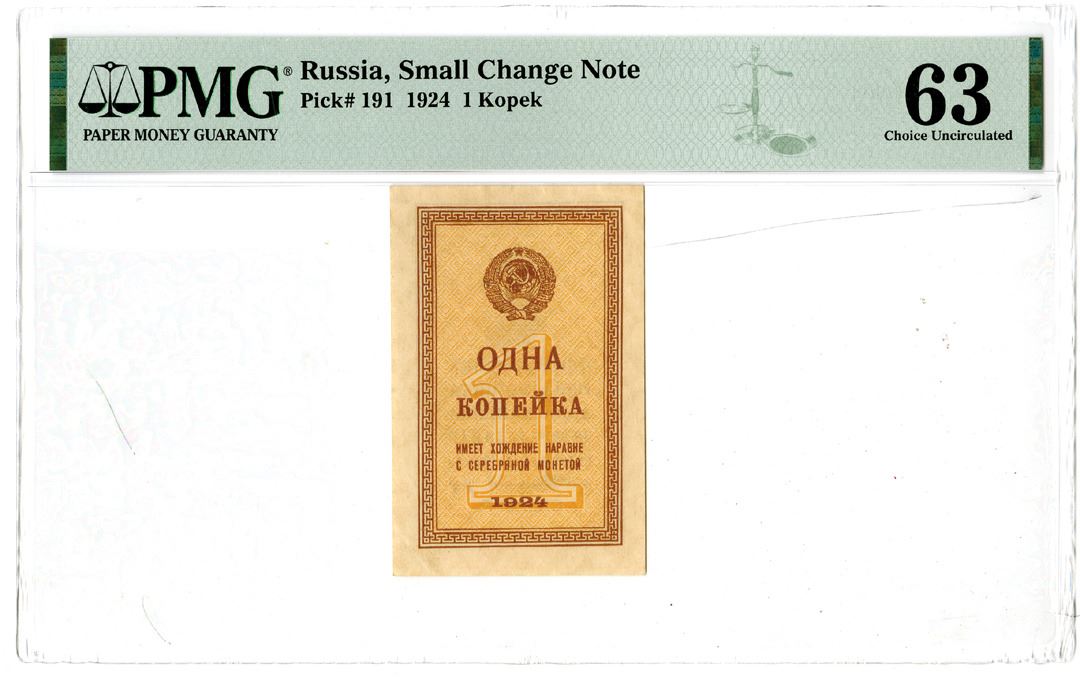 Russia. 1924. 1 Kopek, P-191, Issued banknote, Brown on tan underprint, PMG graded Choice Uncirculated 63 with comment "Minor Foreign Substance."