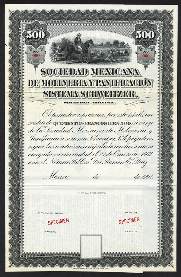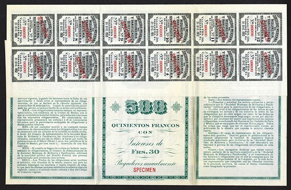 Mexico. Specimen bond. 1902. 500 Francs, Black border and vignette. No undertint. Red SPECIMEN overprint and POC. Coupons attached. XF Condition. ABNC.