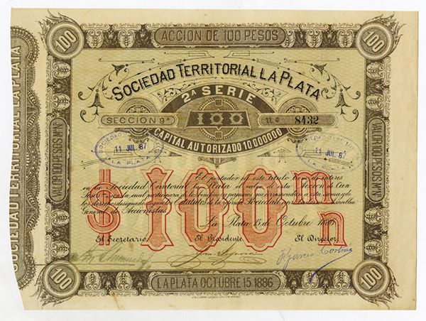 La Plata, Argentina. 100 Pesos Series 2A Issued Stock Certificate, Black print on ornate brown border with red under tint printed in Spanish, Company title at top, Fine-VF condition with cut close margins and staining, C. Grand Cangallo.