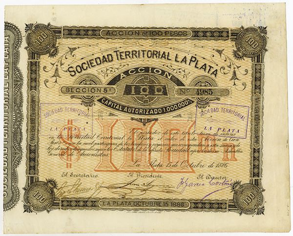 La Plata, Argentina. 100 Pesos Series 5A Issued Stock Certificate, Black print on ornate black border with orange under tint printed in Spanish, Company title at top, VF-XF condition, C. Grand Cangallo.