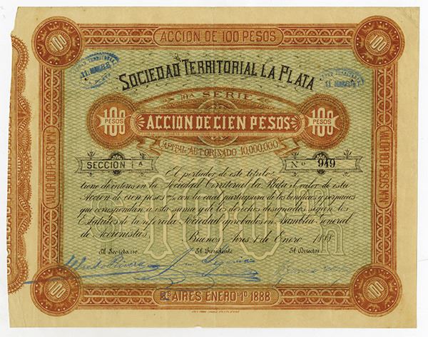 Buenos Aires, Argentina. 100 Pesos Series 1A Issued Stock Certificate, Black print on ornate orange border with pale green under tint printed in Spanish, Company title at top, VF-XF condition with minor stains at margin, C. Grand Cangallo.