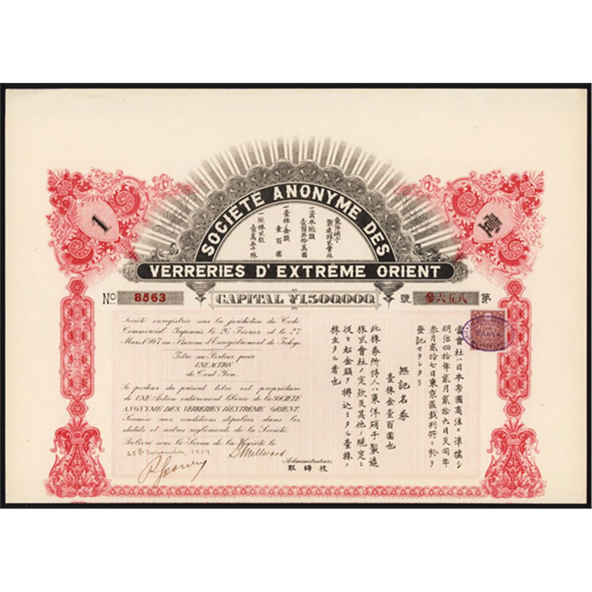 Lot of 2 certificates, Tokyo, Japan, 1907, 1 Share, Issued and uncancelled, Black on red border and pink underprint, Japanese revenue stamp on right, Coupons attached, XF condition, S/N 8363, XF condition, Scarce glass manufacturing stock certificate.