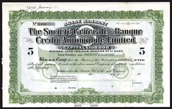 5 Warrants or Shares, Specimen with coupons attached. Undertint of classic antique automobile in light green. Certificate was evidently issued in England for this French company. Certificate measures 15 by 10.5 inches. Certificate is entirely in English. POC's. VF-XF condition. Rare early automobile related stock certificate. Bradbury, Wilkinson & Co. archive.