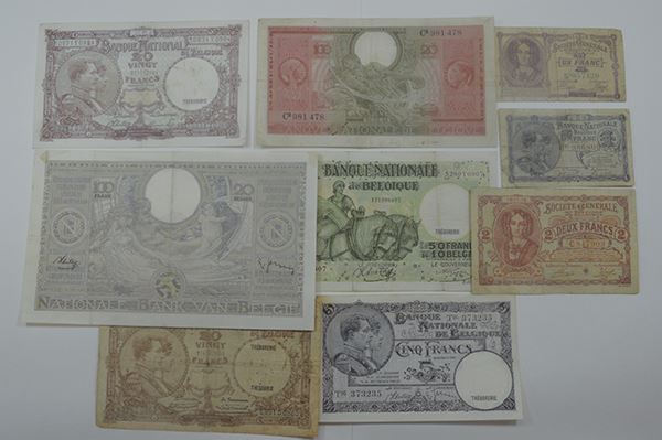 Belgium. 1 Franc P-86a (2), 86b (2); 92 (4); 2 Franc P-87 (1); 5 Francs P-97b (6). 108a (10, some taped and with paper loss); 20 Francs P-98b, 111 (2); 50 Francs P-106 (9); 100 Francs P-95; 102; 107 (5) . Generally Very Good. 44 pieces.