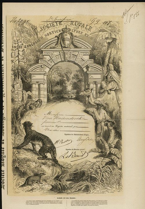 1878 membership certificate, used, minor separation at folds. Exceptional zoo and wildlife vignette with tiger, snakes and camel in front of arch, VF condition.