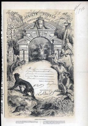 1878 membership certificate, used, minor separation at folds. Exceptional zoo and wildlife vignette with tiger, snakes and camel in front of arch, VF
