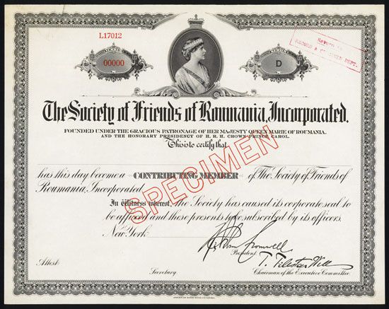 New York & Romania, ND (ca.1910's), Litho certificate for contributing members with vignette of Queen Marie, XF condition, ABNC.