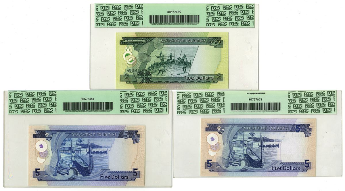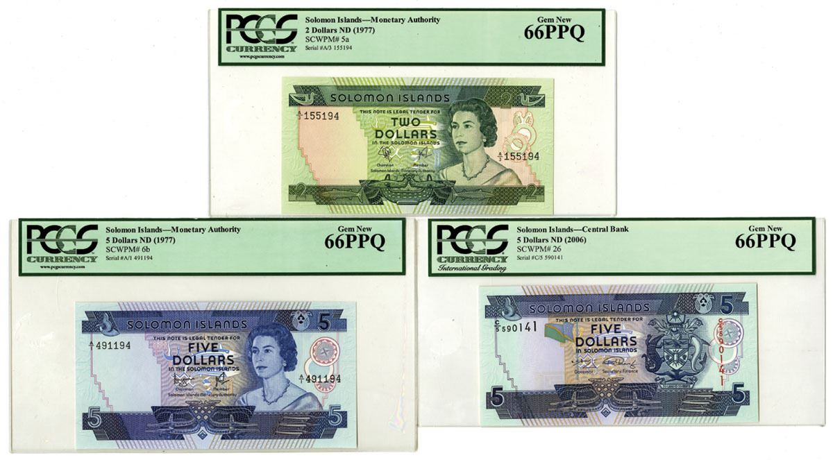 Solomon Islands, ND (1977-2006). Lot of 3 Issued Banknotes, Includes: Monetary Authority of Solomon Islands ND (1977) 2 Dollars, P-5a, S/N A/3 155194, PCGS graded Gem New 66PPQ; ND (1977) 5 Dollars, P-6b, S/N A/1 491194, PCGS graded Gem New 66PPQ; Central Bank of Solomon Islands ND (2006) 5 Dollars, P-26, S/N C/5 590141, PCGS graded Gem New 66PPQ. (3). Sold "AS IS" no returns accepted.