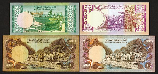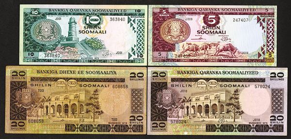 Somalia. 5, 10, 20 Shillings. P-17a Uncirculated; 18 Extremely Fine; 19 (2, One Uncirculated, one Very Fine). 4 pieces