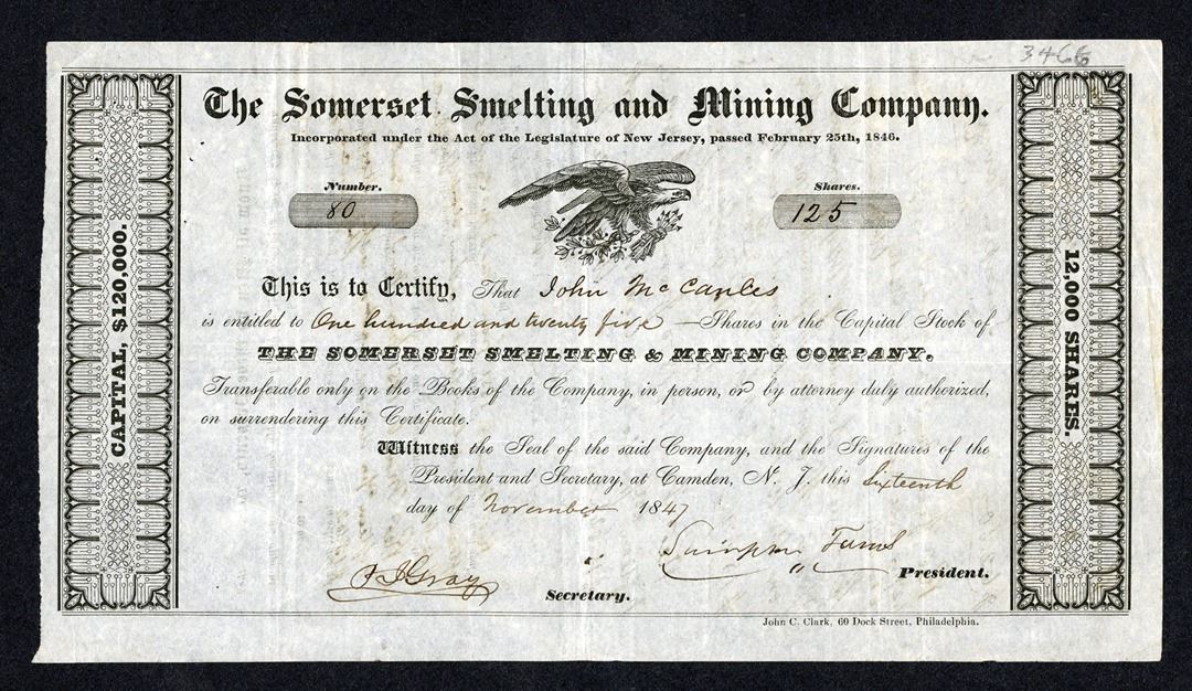 New Jersey, 1847. 125 Shares I/U Capital Stock Certificate #80, Black text with black border, Eagle at top center. Fine-VF condition, especially considering its age. Handwritten records on back. Extremely early New Jersey mining stock certificate.