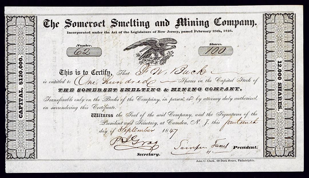 Camden, New Jersey, 1847, 100 Shares, Issued and uncancelled, Patriotic eagle on top, Cert.# 62, XF condition. Attractive, rare and early NJ mining stock certificate.