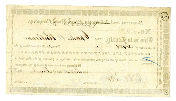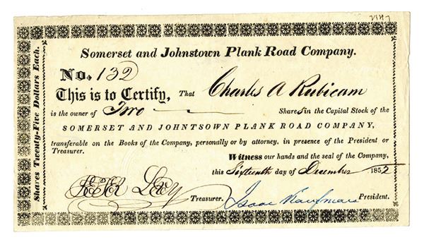 Pennsylvania, 1 Share = $25. I/U, black on thick paper, S/N 132, VF condition. Rare Turnpike Certificate.