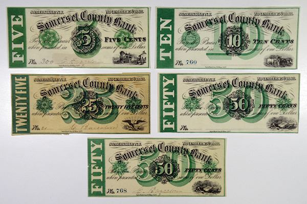 Somerville, NJ. Lot of 5, 1862 dated notes, Includes 5 cts, 10 cts, 25 cts, 50 cts, Wait 2213-2216, R-4. The 5 cent, 25 cent and 50 cent notes all are signed but may be fraudulent signatures. No examples have been offered in Heritage auctions. Culver Barcalow issued Merchant Scrip Notes during the Civil War. Although the Wait book lists these as an unknown issuer, there is evidence they were issued by Culver Barcalow. XF to Uncirculated. (5)