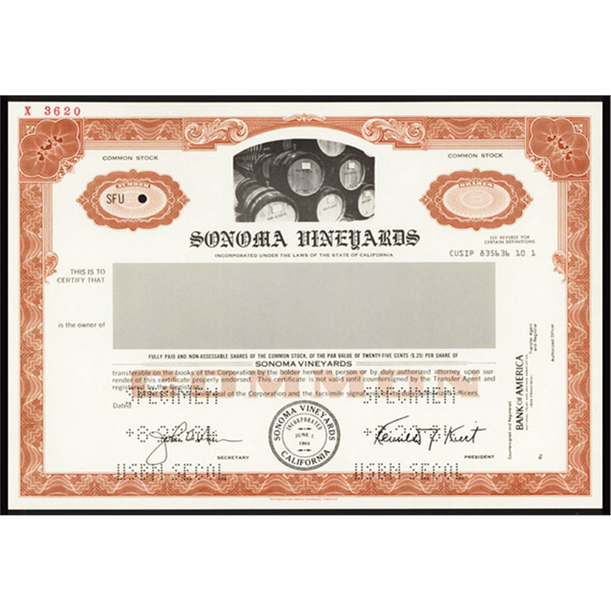 Sonoma, California, 1984, Specimen, Odd Shares, Photographic Wine barrel vignette, chestnut brown, Pin punch cancels, XF. Rare wine industry stock certificate. Ken Kwit facsimile signature as president of Sonoma Vineyards, Inc., at the time the largest publicly held winery in America. SCBNC. XF