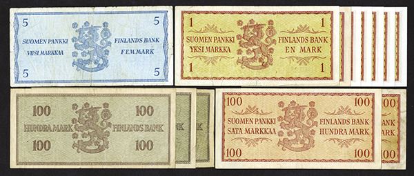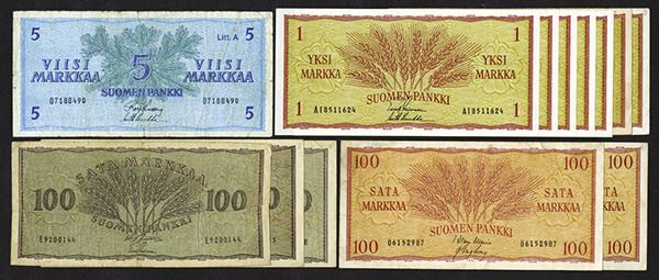 Finland. 1, 5, 100 Markkaa. SCWPM 91a (3); 97A (2); 98 (6), 103a. Four 98a's are Uncirculated. Otherwise Very Good with paper separation at fold to Fine. 12 pieces.