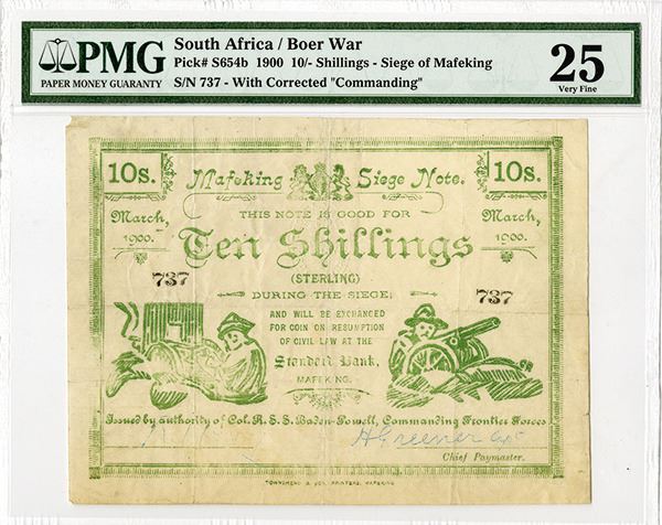 South Africa, 1900, 10 Shillings, P-S654b, Issued, Green printing, Soldiers on lower left and right, S/N 737, with corrected "Commanding", note of corner tip missing and small split, Rare note in any form or condition.