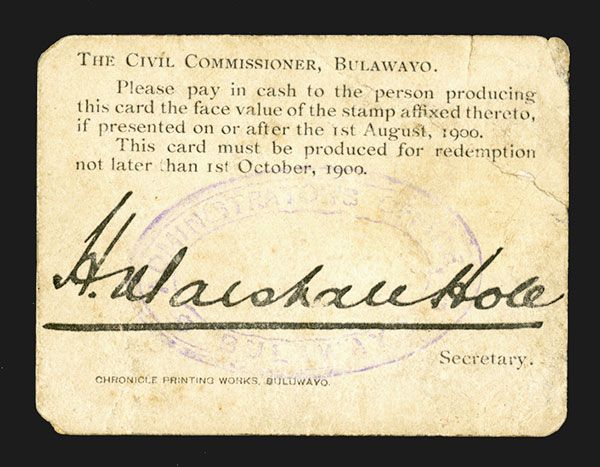 Pick #S665. 1 Shilling, Adhesive stamp of British South Africa on card. Very Good or a bit better. Seldom seen.